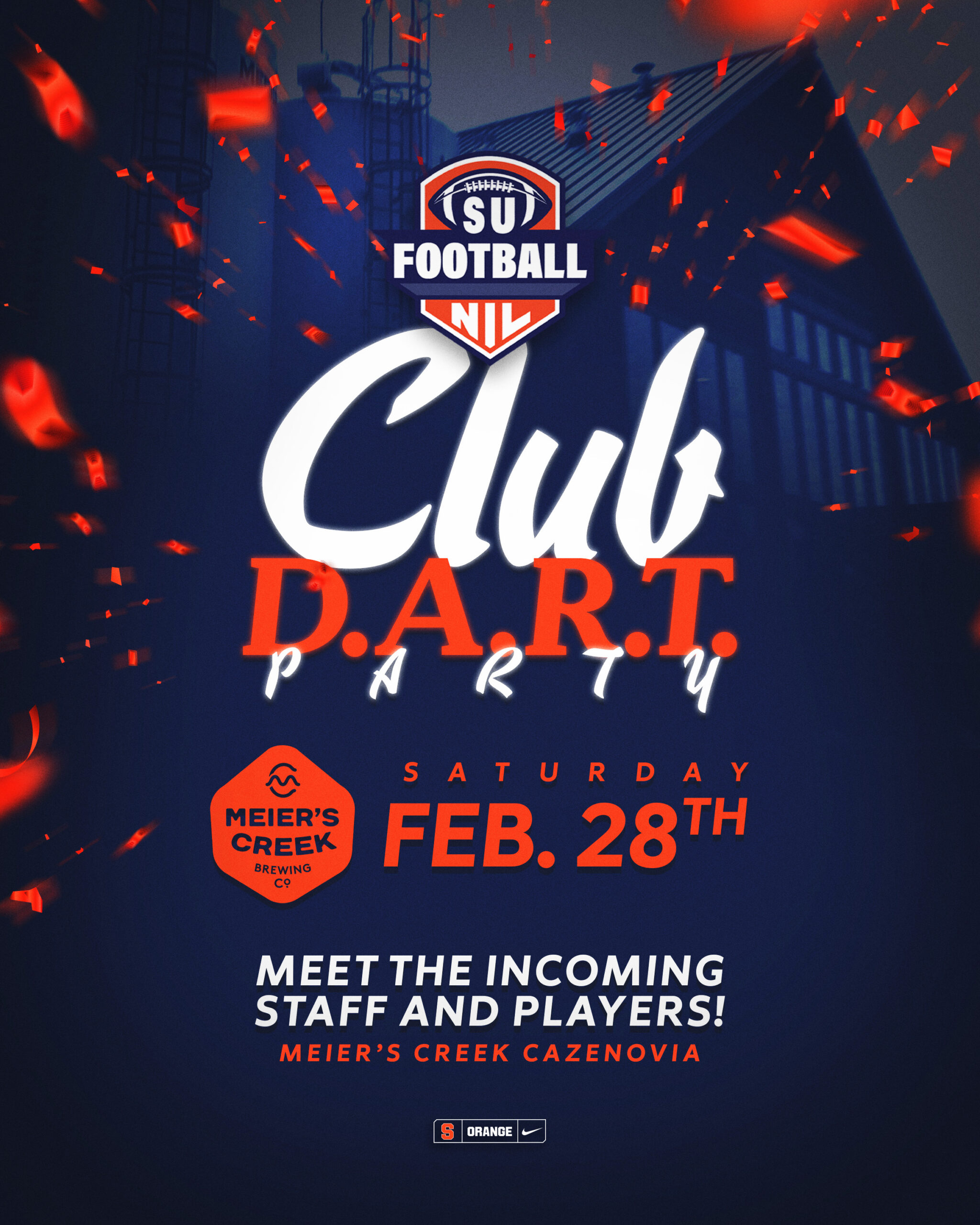 Join us for the 2nd Annual Club Dart Party at Meier’s Creek Cazenovia to meet our newest players and staff and hear from Head Coach Fran Brown. Enjoy an open bar and heavy hors d’oeuvres while helping support Syracuse Football and the future of our program.