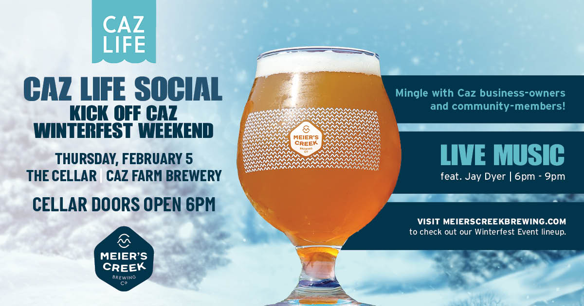 Kick off Caz Winterfest Weekend with a relaxed evening of beer, music, and community at Meier’s Creek 🍻❄️ The Caz Life Social is all about bringing people together- local business owners, neighbors, and Winterfest fans alike- for an easygoing night in The Cellar.