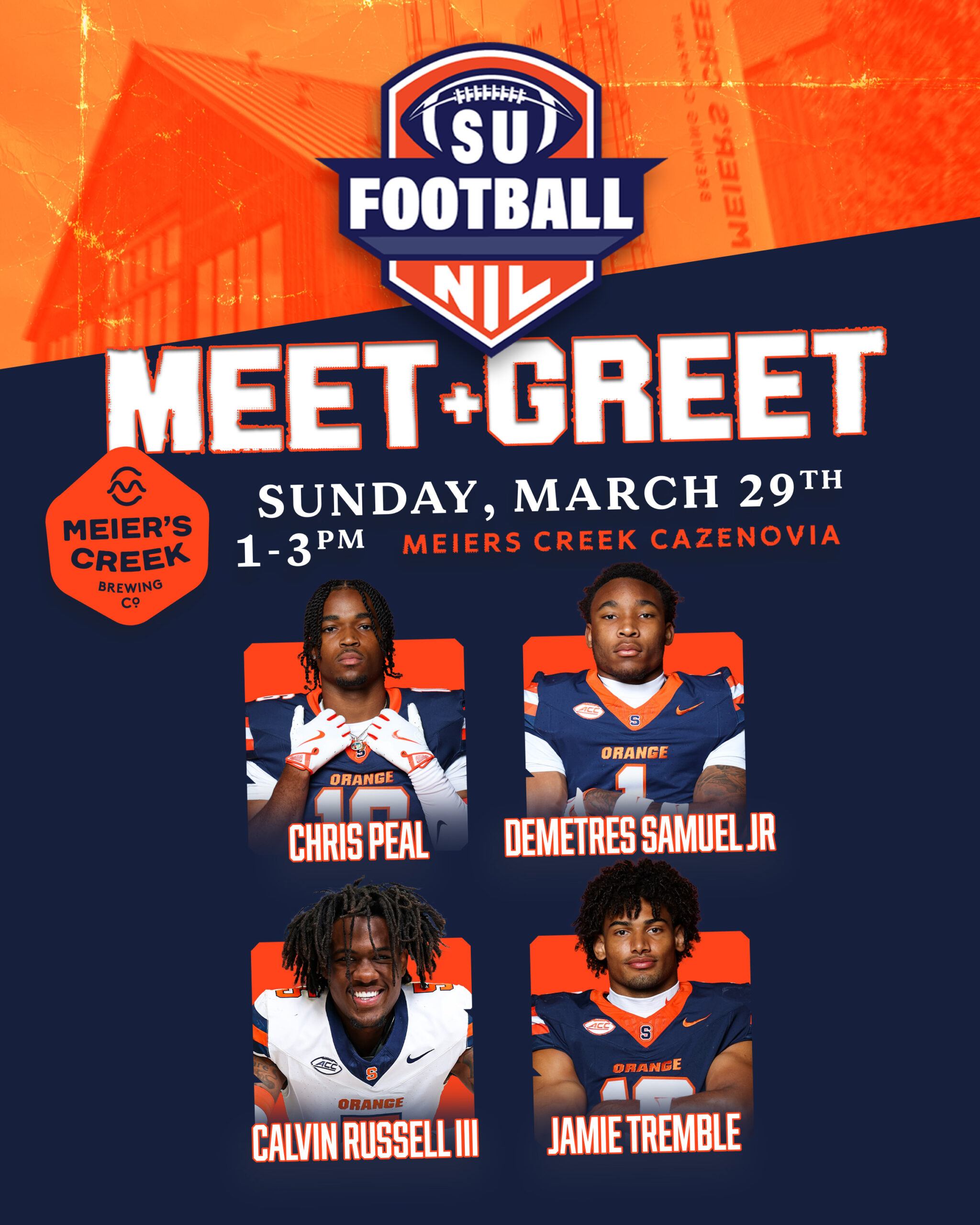 Meet the squad 🎯🏈 Join us for an SU Football NIL Meet & Greet at Meier’s Creek Cazenovia this Sunday, March 29 from 1–3 PM! 🔥Get up close with Chris Peal, Demetres Samuel Jr, Calvin Russell III, and Jamie Tremble. Come hang, grab a pint, and rep the Orange. Let’s go, Syracuse Football! 🍊🏈