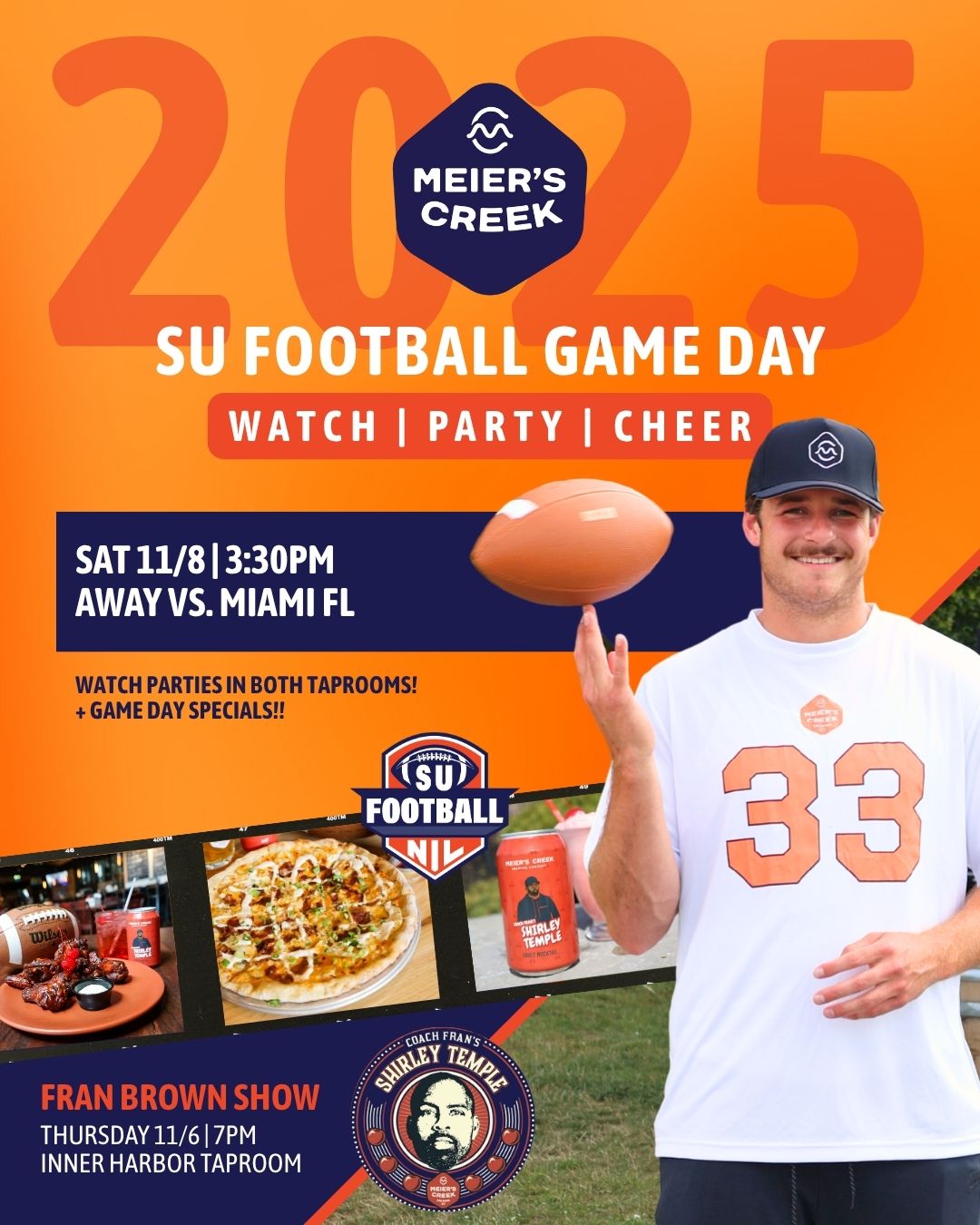 It’s SU vs Miami FL and we have everything you need to keep the spirits high! Saturday, 11/8, away game kickoff is at 3:30pm!